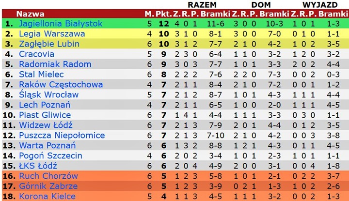 Od piątku do niedzieli rozegrano siedem meczów 6. kolejki PKO Ekstraklasa. Cracovia po wyjazdowym bezbramkowym remisie z Wartą Poznań awansowała z 5. na 4. miejsce w tabeli. Pasy mają 3 punkty straty do lidera (-1), 1 punkt straty do strefy medalowej (0) i 4 punkty przewagi nad strefą spadkową (0).