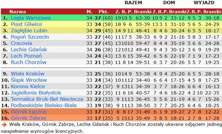 Po czwartkowych meczach 34. kolejki Ekstraklasy. Niespodzianka w Lubinie