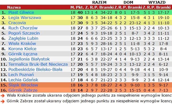 Ogromną niespodzianką zakończył się mecz w Zabrzu, gdzie ostatni w tabeli Górnik znokautował 5:2 rewelacyjnego lidera Piasta Gliwice. Pierwszą bramkę już w 7. minucie strzelili gospodarze, ale jeszcze przed przerwą Piast objął prowadzenie po golach w 36 (samobójcza) i 39 minucie. Rozstrzygające dla losów pojedynku było pięć minut między 56 a 61 minutą, gdy zabrzanie błyskawicznie strzelili trzy bramki. Ale to nie był koniec radości miejscowych kibiców, bo w 82 minucie zabrzanie po raz piąty umieścili piłkę w bramce lidera. (W sobotę Cracovia gra z Piastem w Gliwicach).